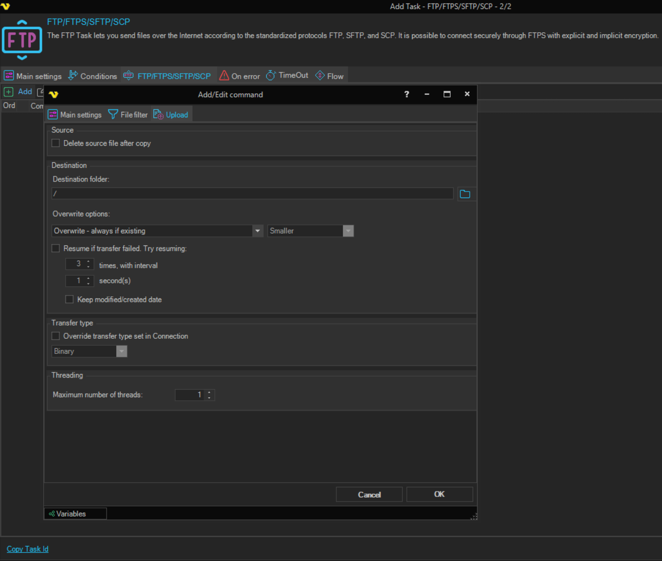 - Overwrite - if destination size is -: with this option you can overwrite a file depending on destination file size compared to the original file size on the ftp