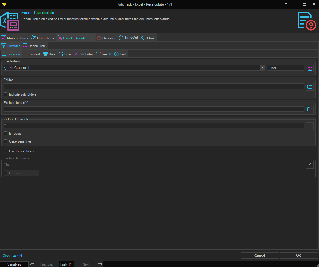 Recalculates an existing Excel function/formula within a document and saves the document afterwards. This Task cannot update data from other data sources. Use the Office Macro Task for that.