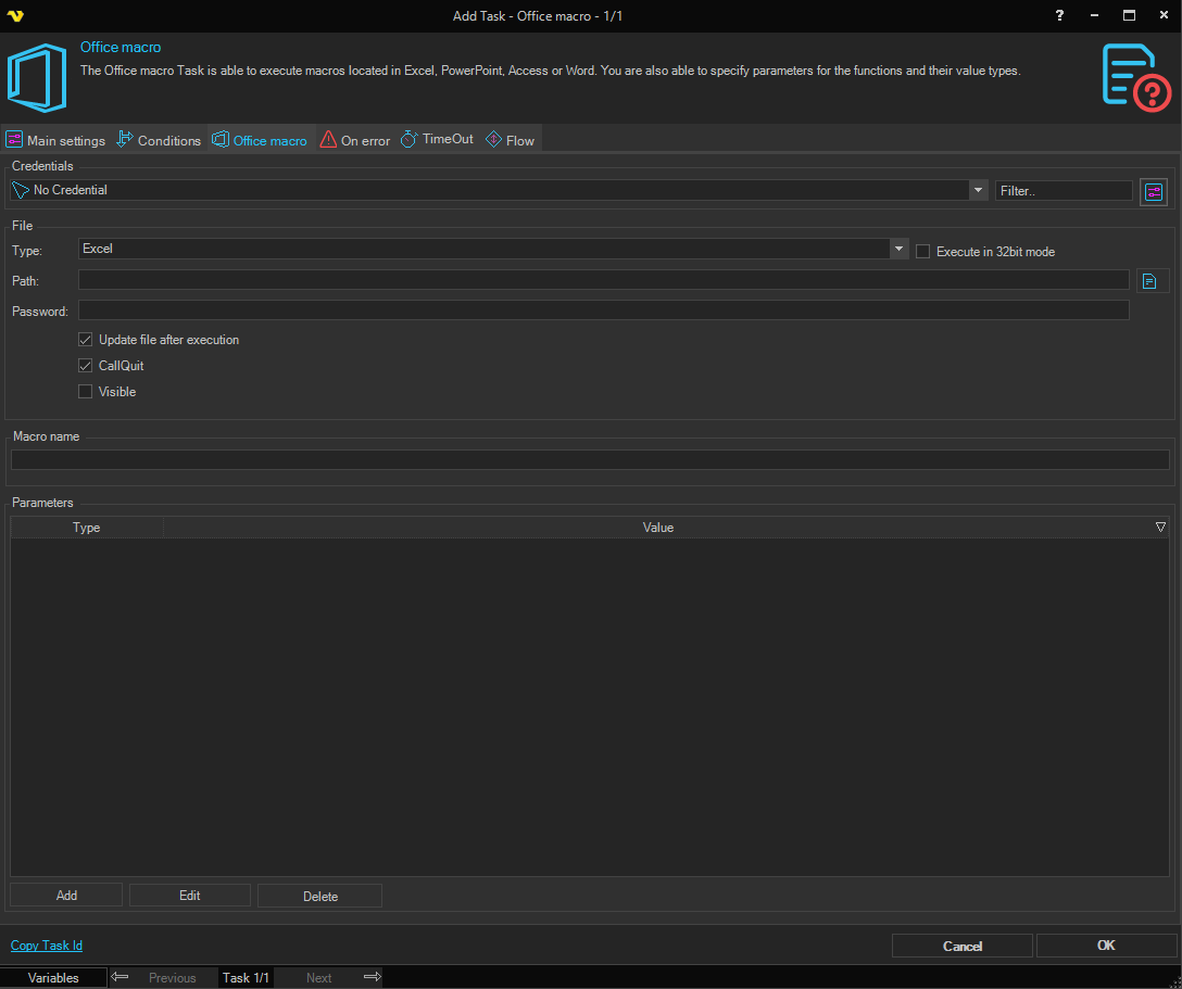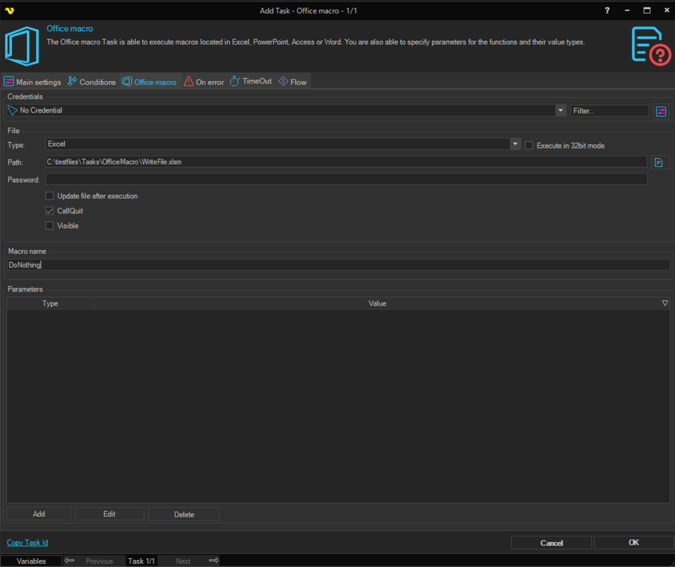 The Office macro Task is able to execute macros located in Excel, PowerPoint, Access or Word. You are also able to specify parameters for the functions and their value types.