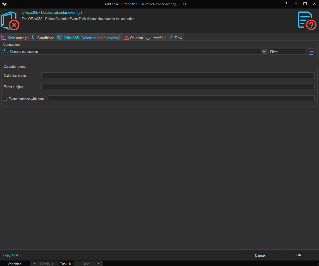 The Office365 - Delete Calendar event Task lets you delete a Calendar event in the Office365 cloud. The Task uses the Office365 Connection.