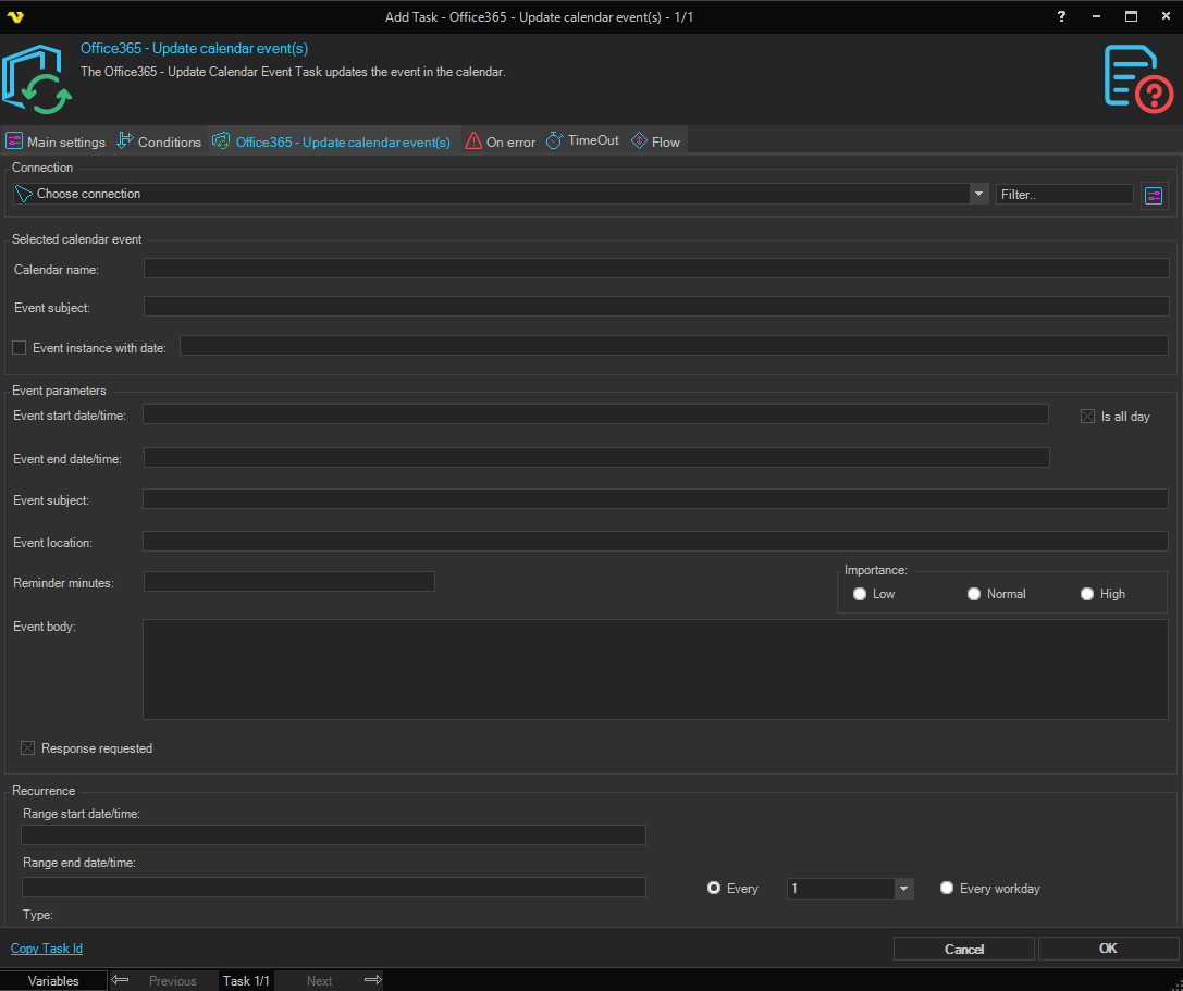 The Office365 - Update Calendar event Task lets you update a Calendar event in the Office365 cloud. The Task uses the Office365 Connection.