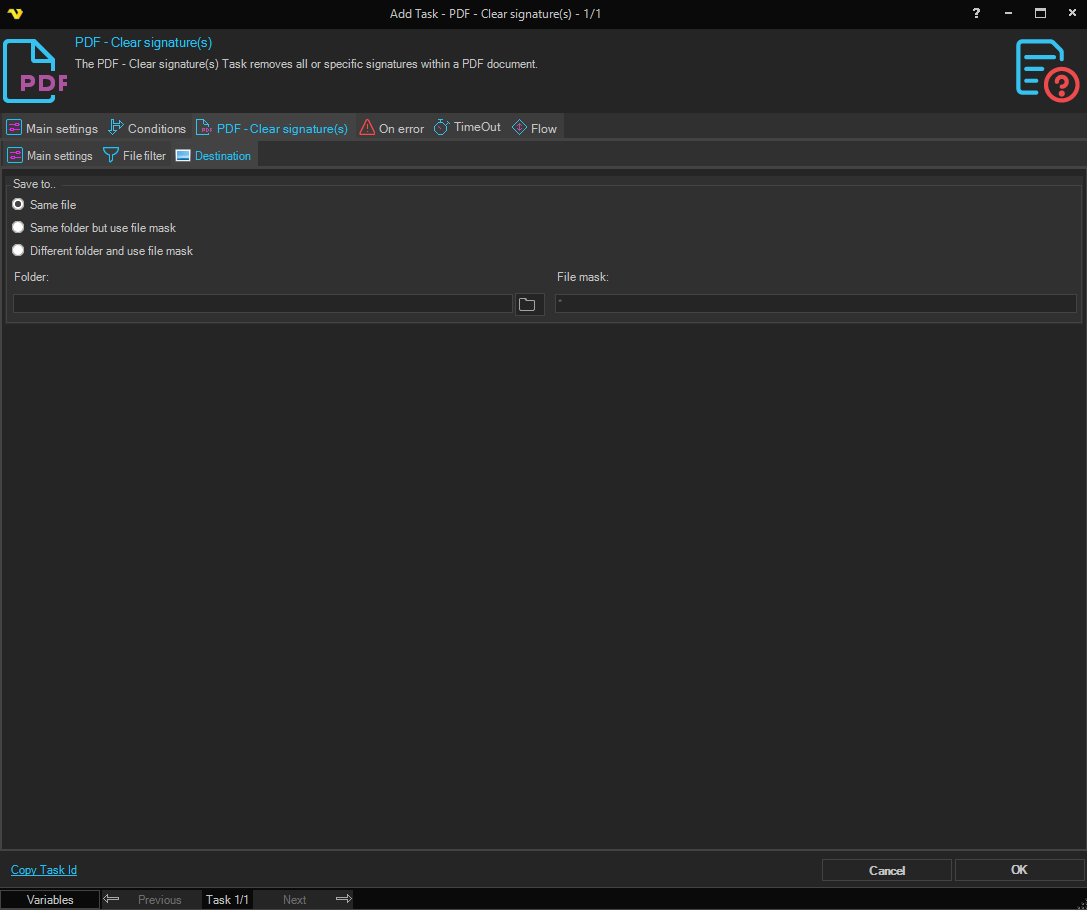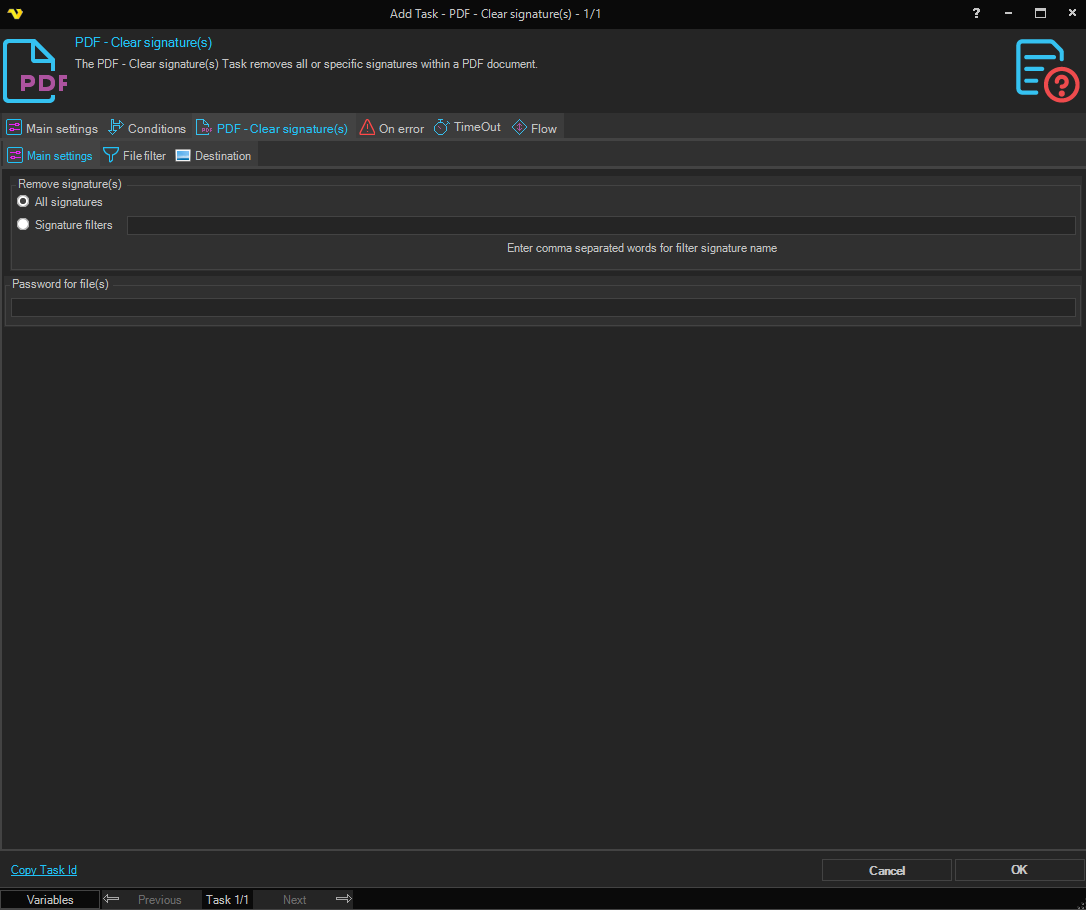 The PDF - Clear signature(s) Task removes all or specific signatures within a PDF document.