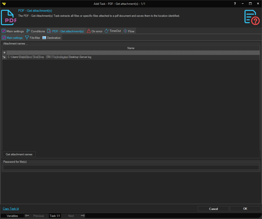 The PDF - Get attachment(s) Task extracts all files or specific files attached to a pdf document and saves them to the specified location file(s).