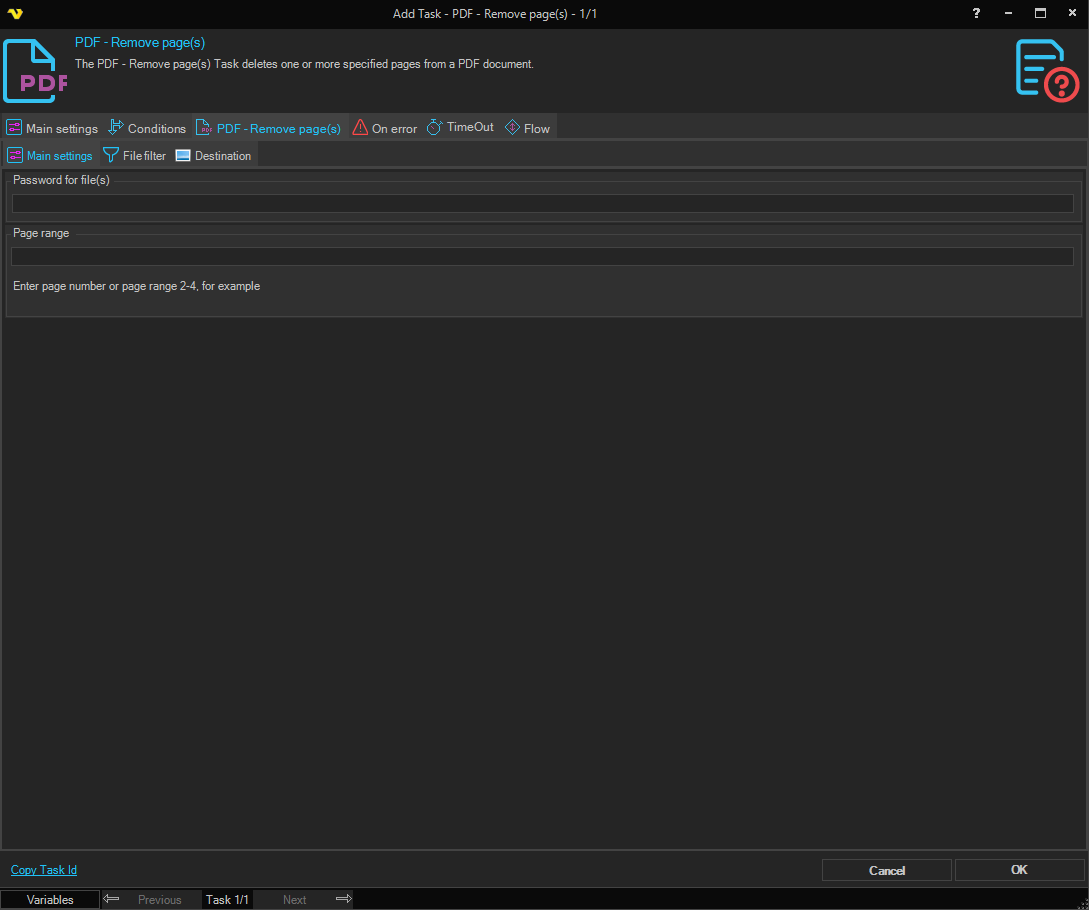 The PDF - Remove pages(s) Task deletes one or more specified pages from a PDF document.