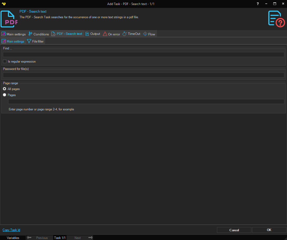 The PDF - Search text Task searches for the occurrence of one or more text strings in a pdf file..
