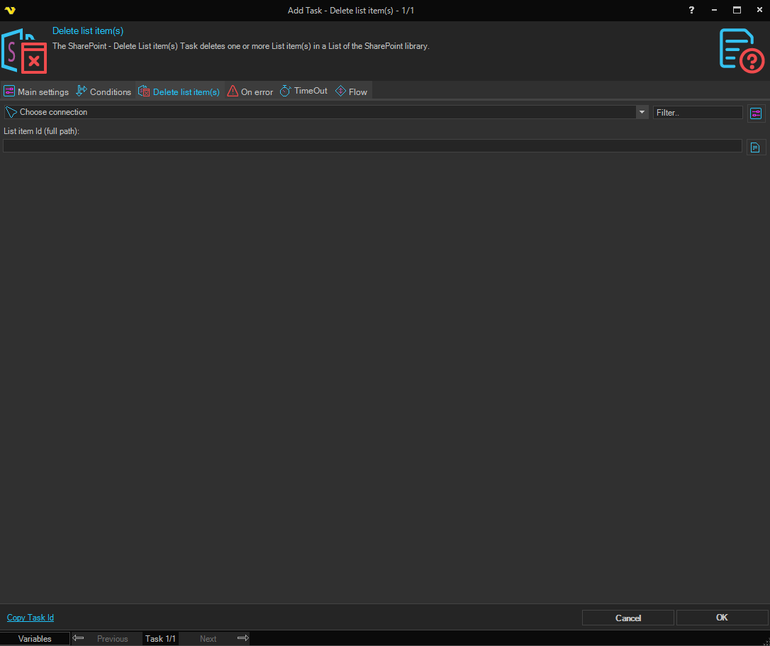 The SharePoint - Delete List item(s) Task deletes one or more List item(s) in a List of the SharePoint library.