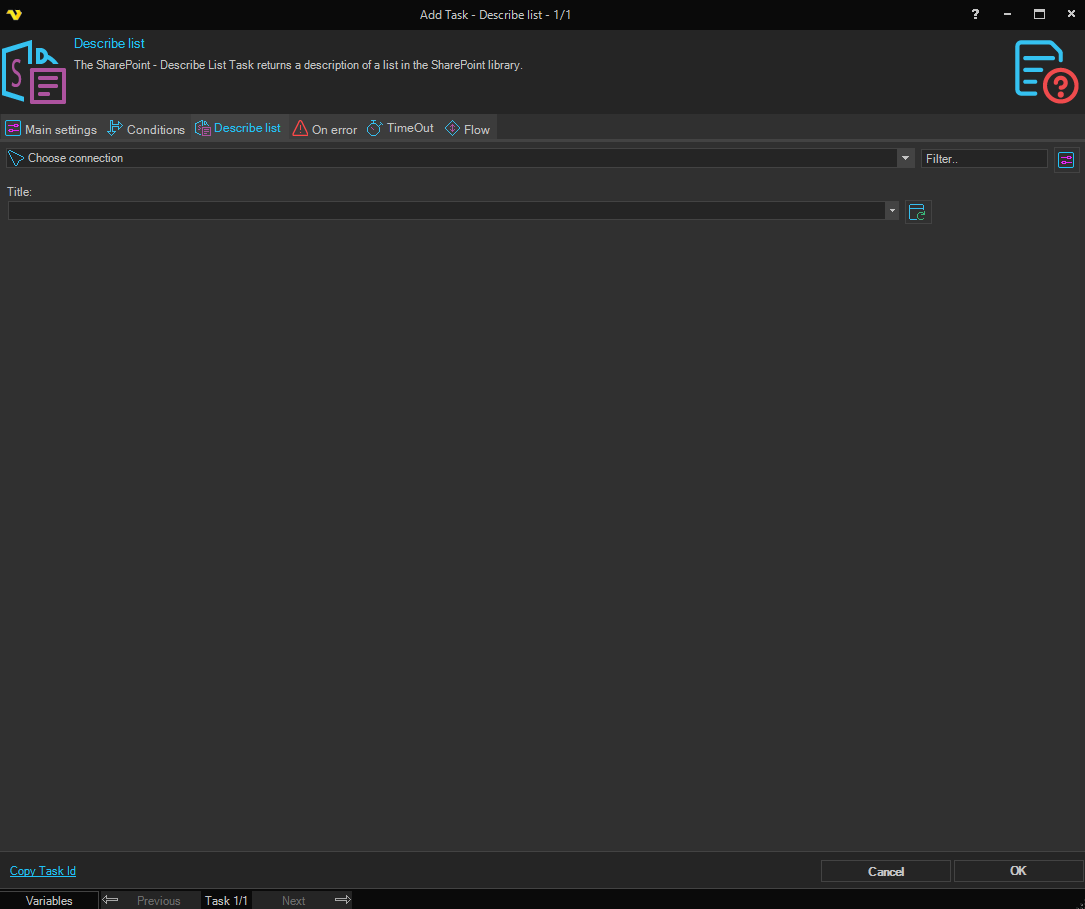 The SharePoint - Describe List Task returns a description of a list in the SharePoint library.