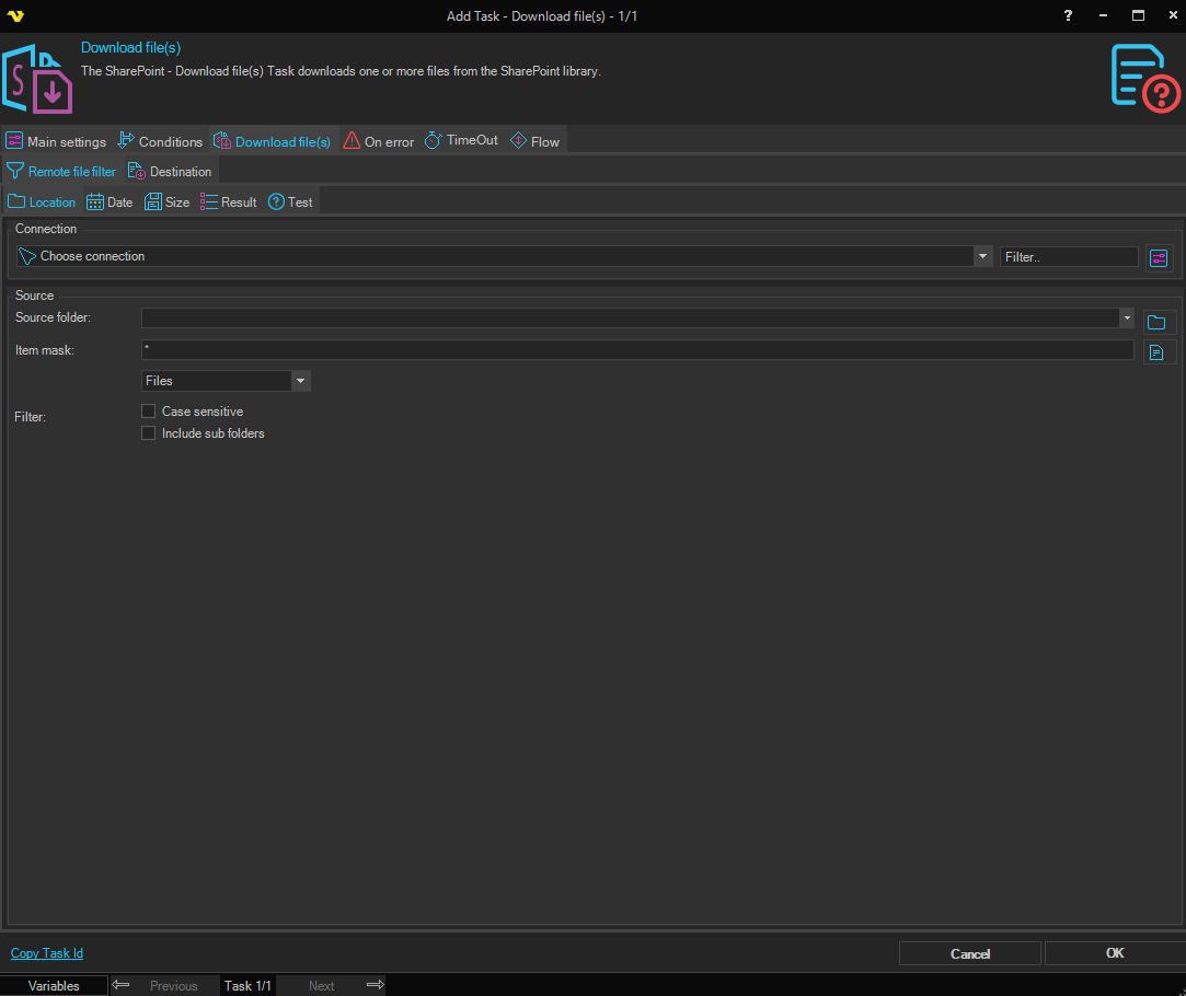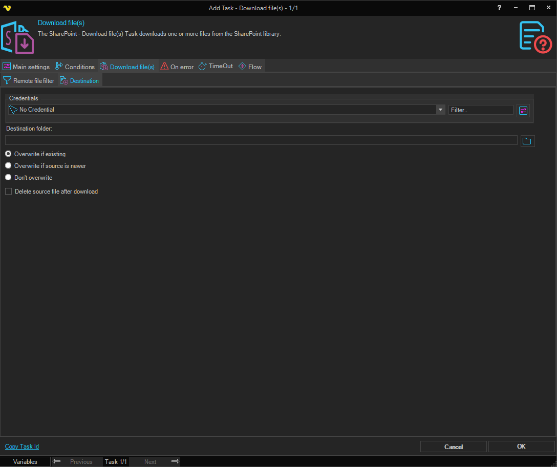 The SharePoint - Download file(s) Task downloads one or more files from the SharePoint library.