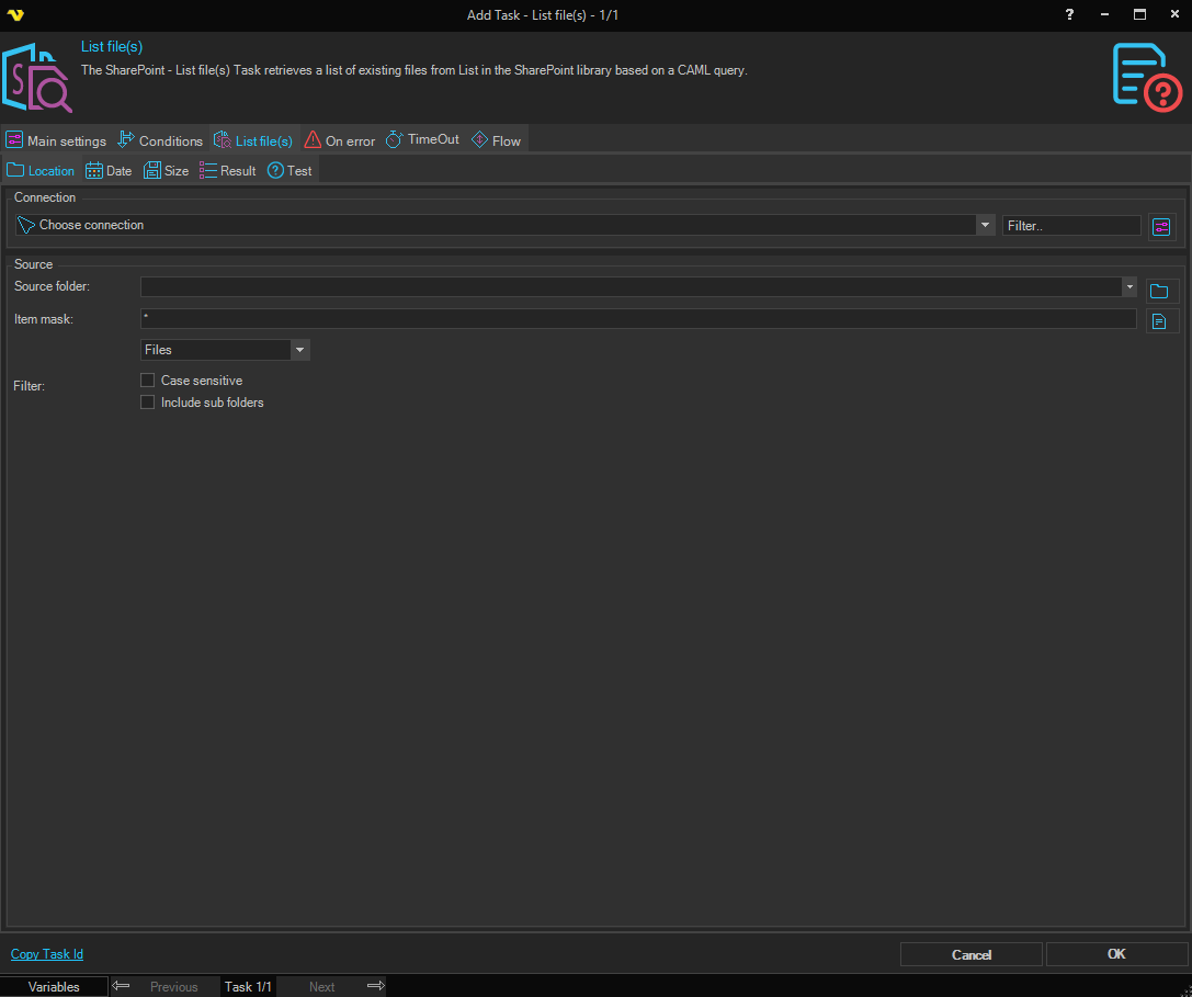 The SharePoint - List file(s) Task retrieves a list of existing files from List in the SharePoint library based on a CAML query.