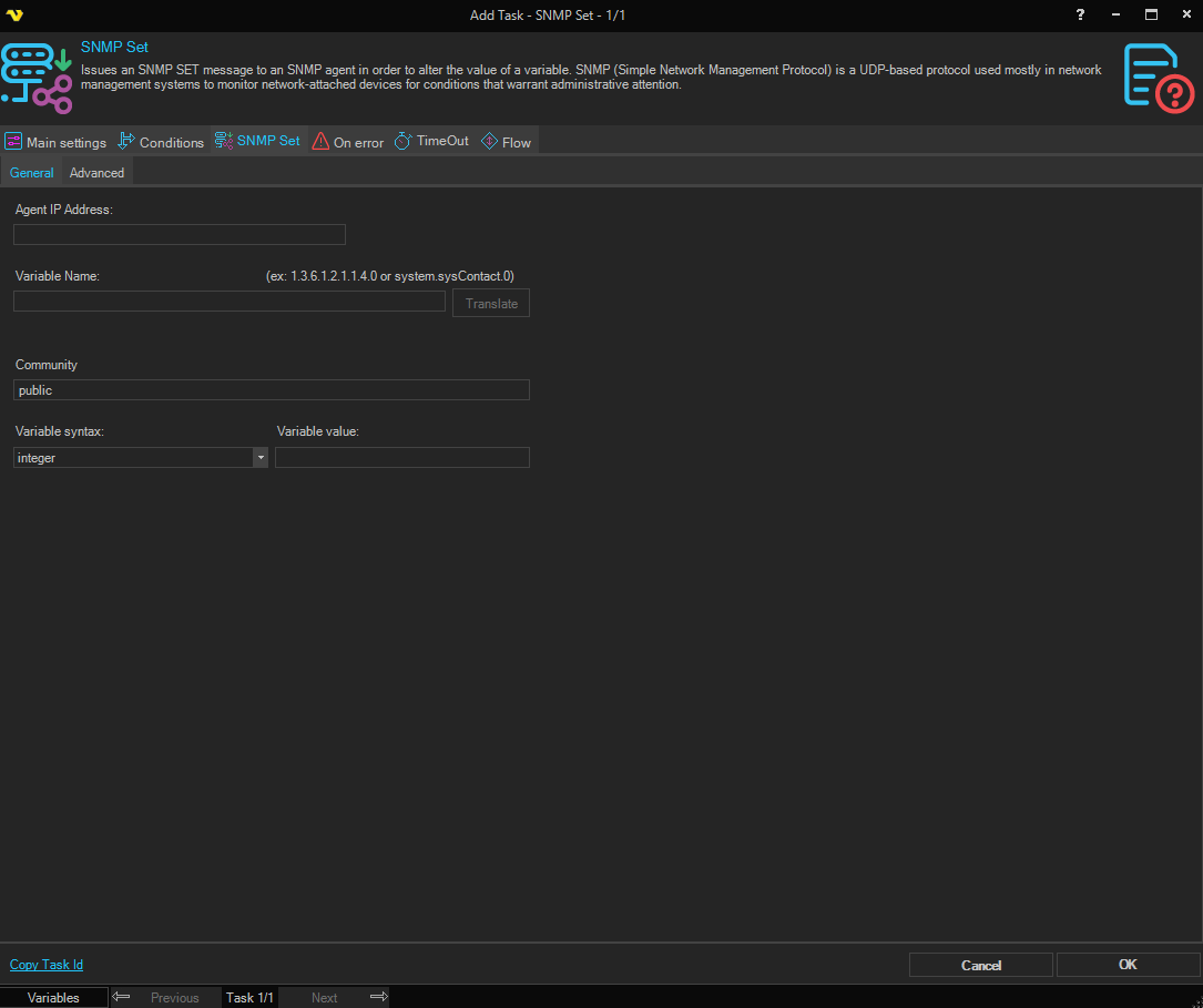 Issues a SNMP SET message to an SNMP agent in order to alter the value of the variable. SNMP (Simple Network Management Protocol) is a UDP-based protocol used mostly in network management systems to monitor network-attached devices for conditions that warrant administrative attention.