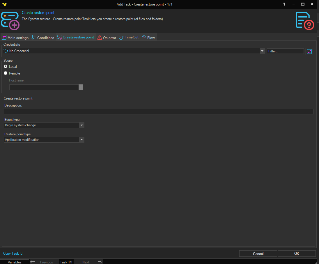 The System restore - Create restore point Task lets you create a restore point (of files and folders).
