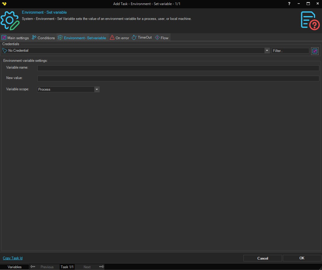 System - Environment - Set Variable sets the value of an environment variable for a process, user or local machine.