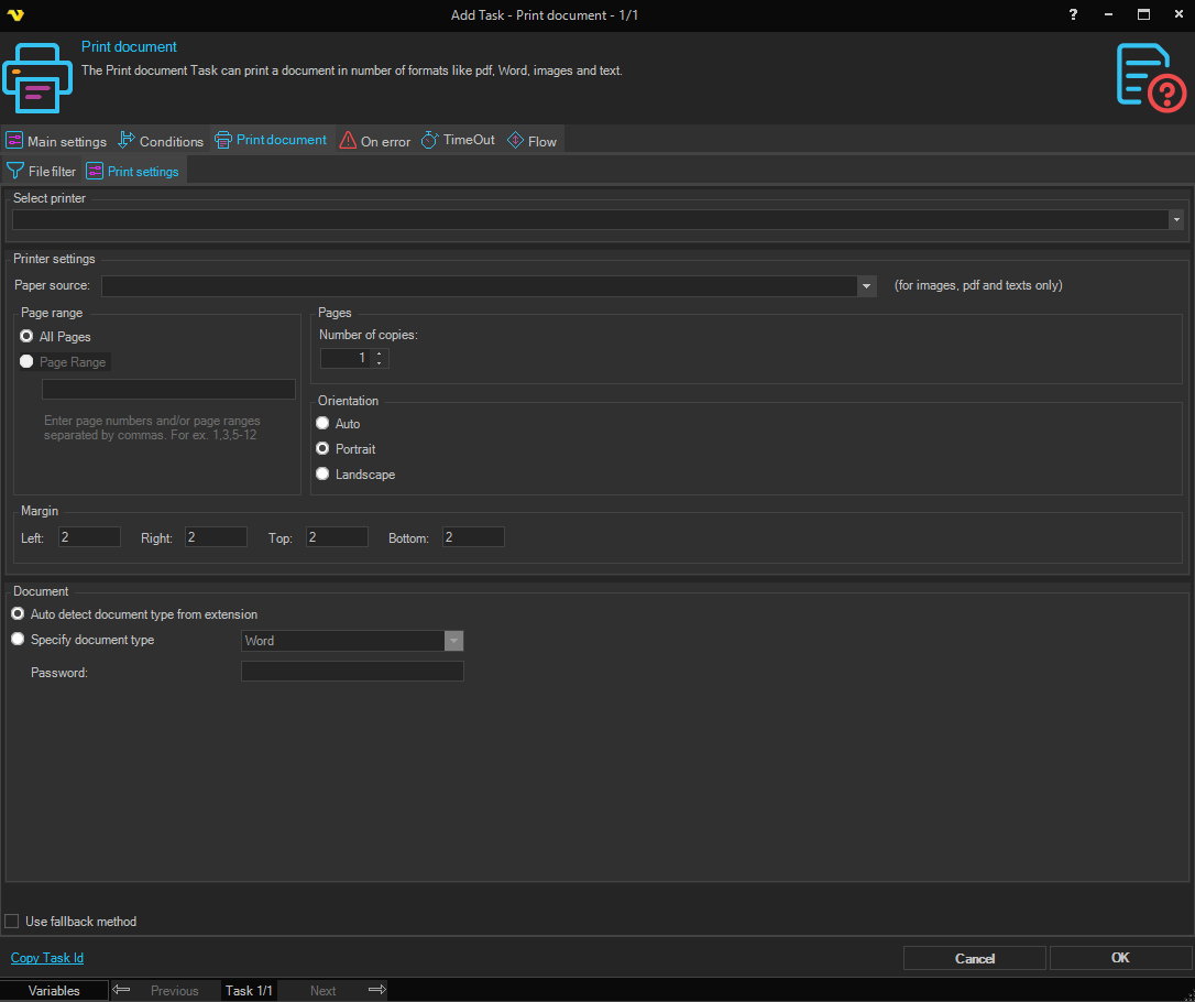 The Print document Task can print a document in number of formats like pdf, Word, images and text.