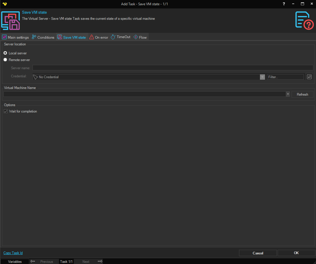 The Virtual Server - Save VM state Task saves the current state of a specific virtual machine.