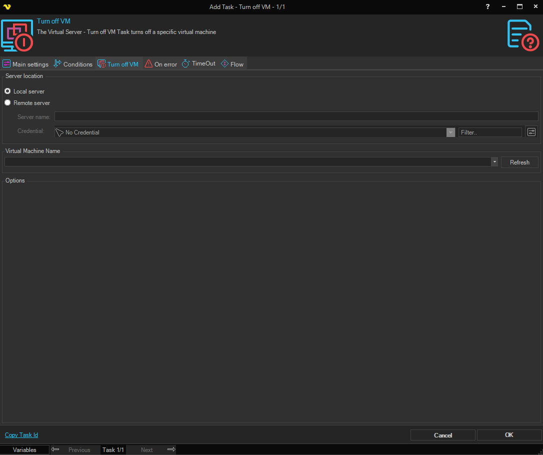 The Virtual Server - Turn off VM Task turns off a specific virtual machine.