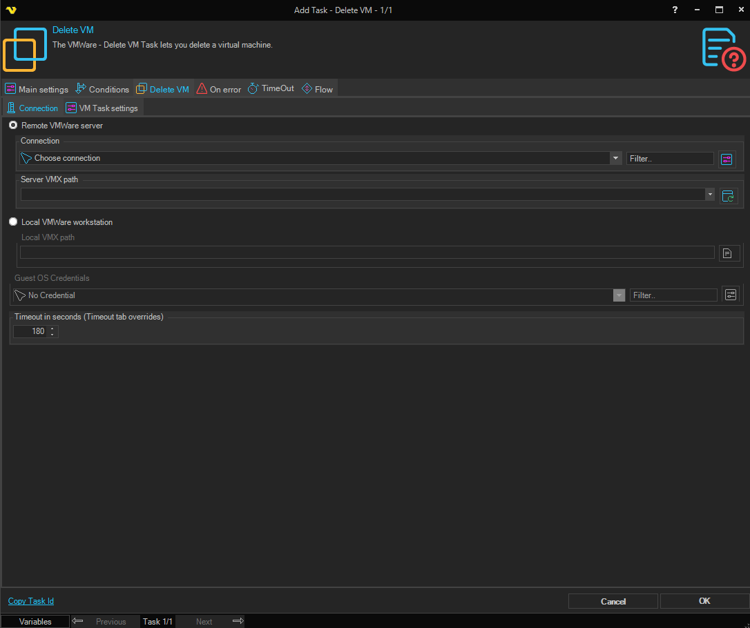 The VMWare - Delete VM Task lets you delete a virtual machine.