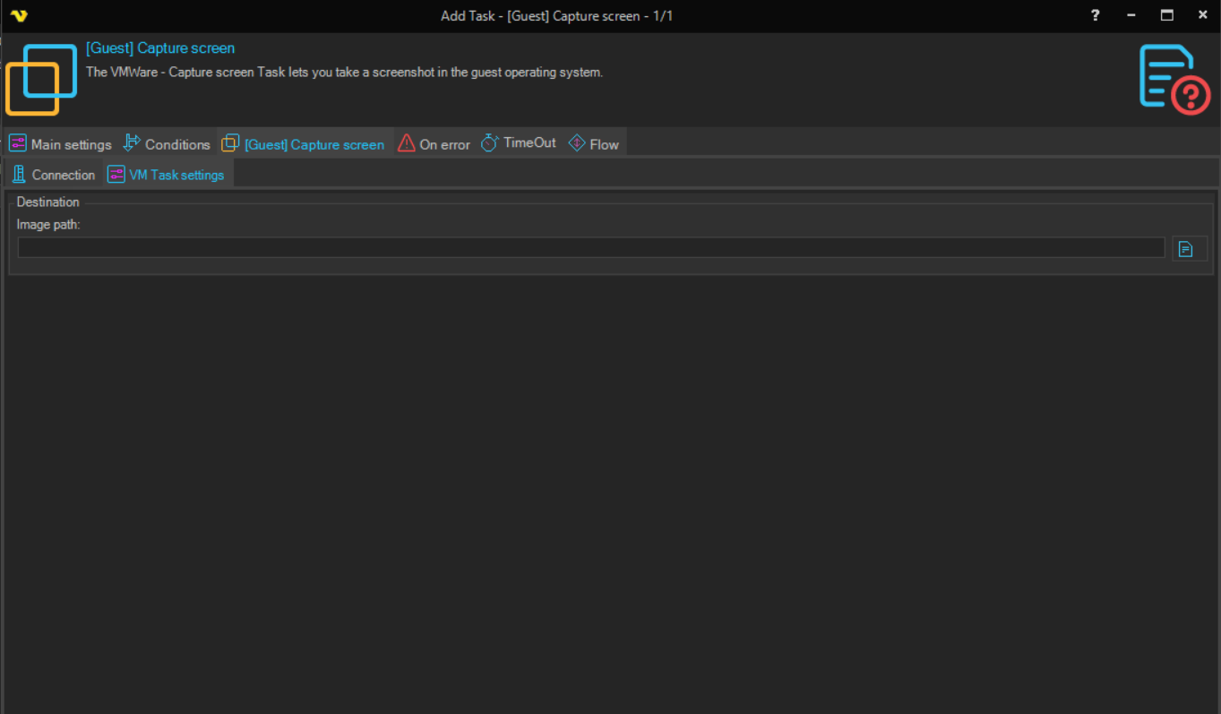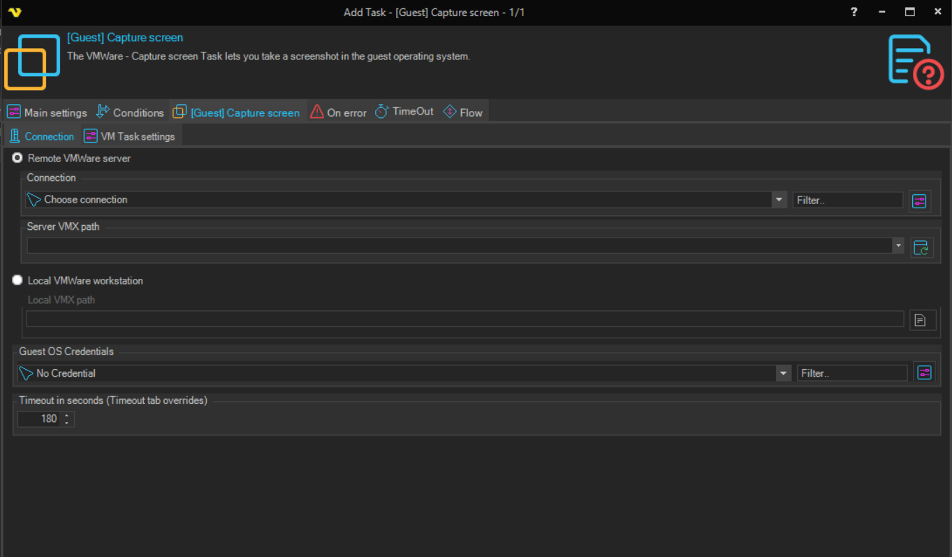The Connection settings window is the same for all VMWare Task types. See Start VM for details.