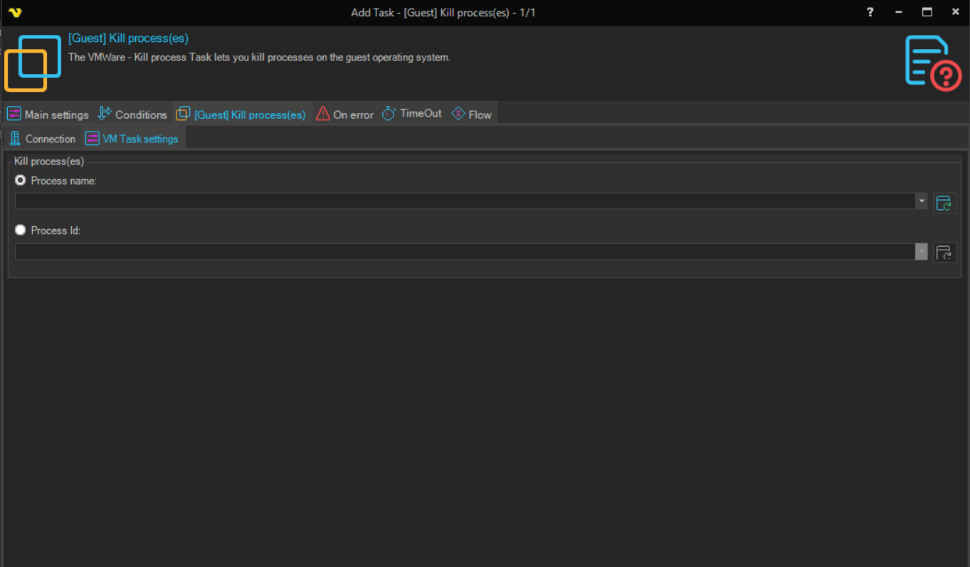 The Connection settings window is the same for all VMWare Task types. See Start VM for details.