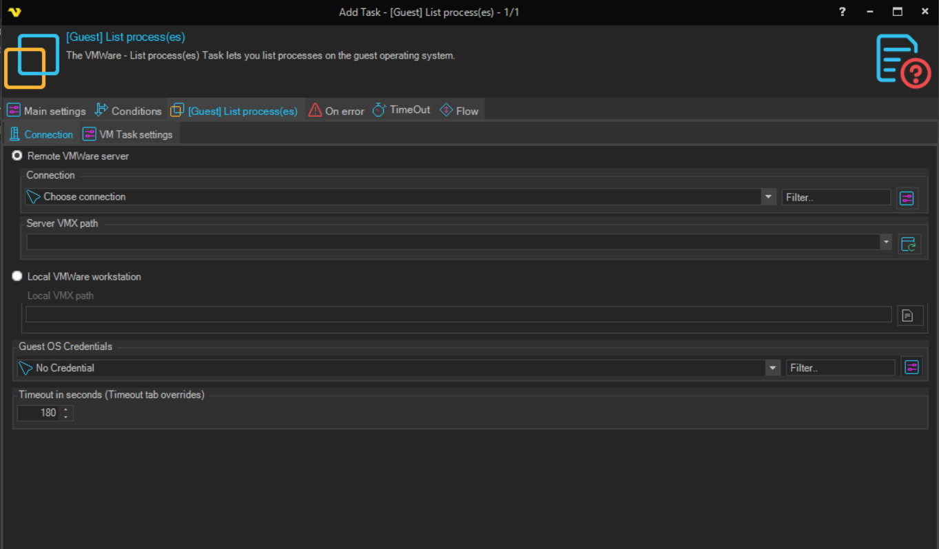 The Connection settings window is the same for all VMWare Task types. See Start VM for details.