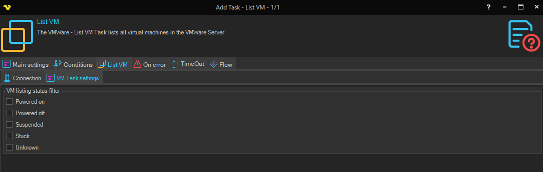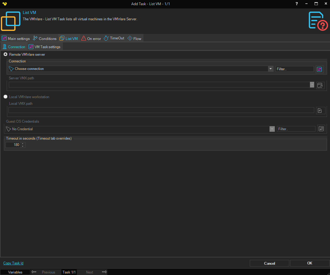 The VMWare - List VM Task lists all virtual machines in the VMWare Server.