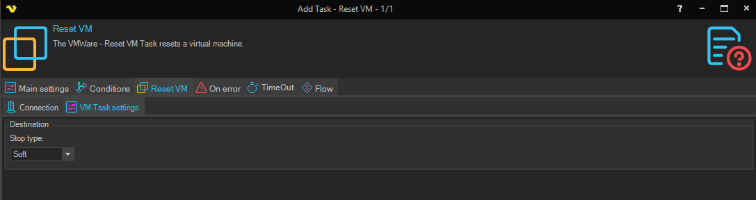 The Connection settings window is the same for all VMWare Task types. See Start VM for details.