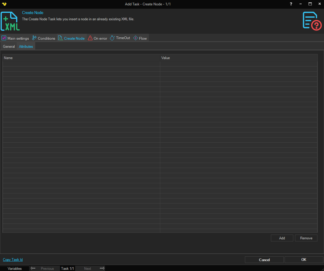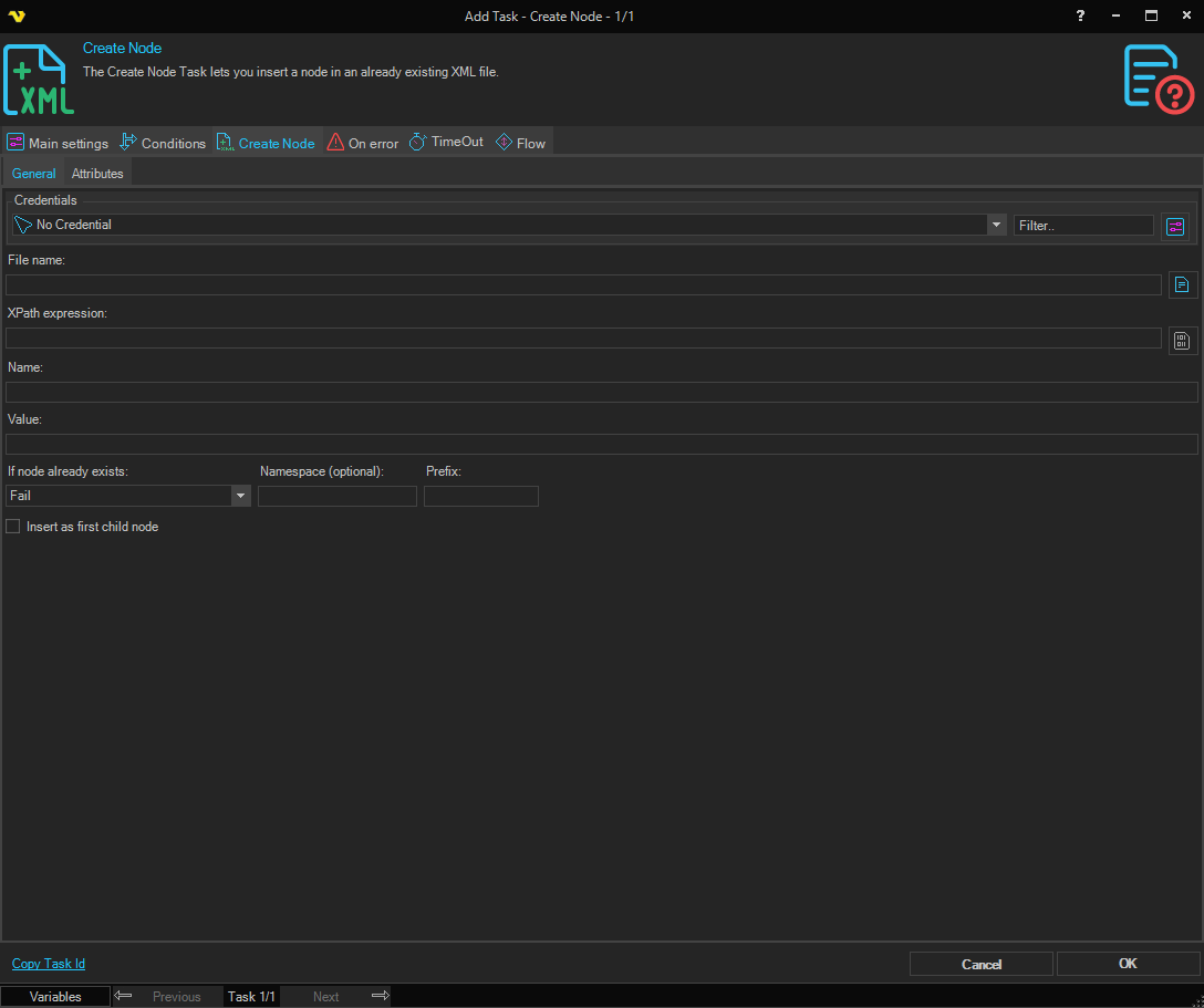 The Create Node Task lets you insert a node in an already existing XML file.