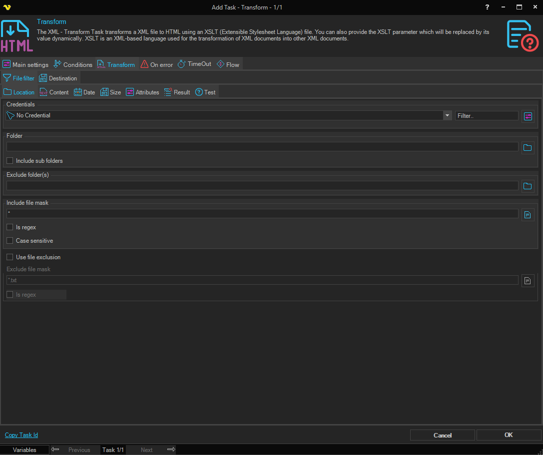 The XML Transform Task uses the standard VisualCron File filter to define the properties of the listed files.