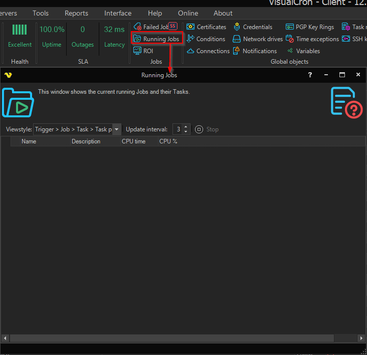 The VisualCron processes are monitored and ended from the main menu Server > Jobs > Running Jobs dialog. With this dialog all VisualCron processes are viewed, even those not visible in Windows Task Manager (e.g. a web request).