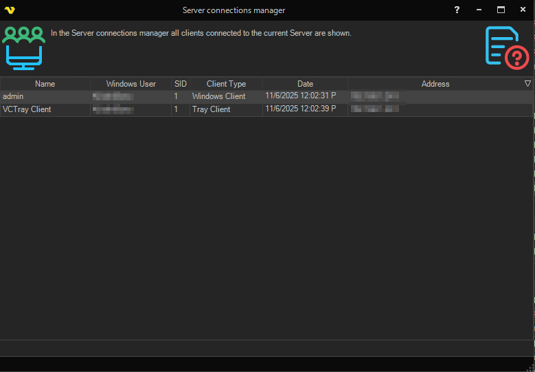 In the main menu Server > Main settings > Client connections dialog, VisualCron clients are managed. Several VisualCron clients can be connected to the same VisualCron server, typically one client both has the VisualCron client application and the VisualCron tray client connected to the same server. See below for a list of clients that are connected to the currently selected server.