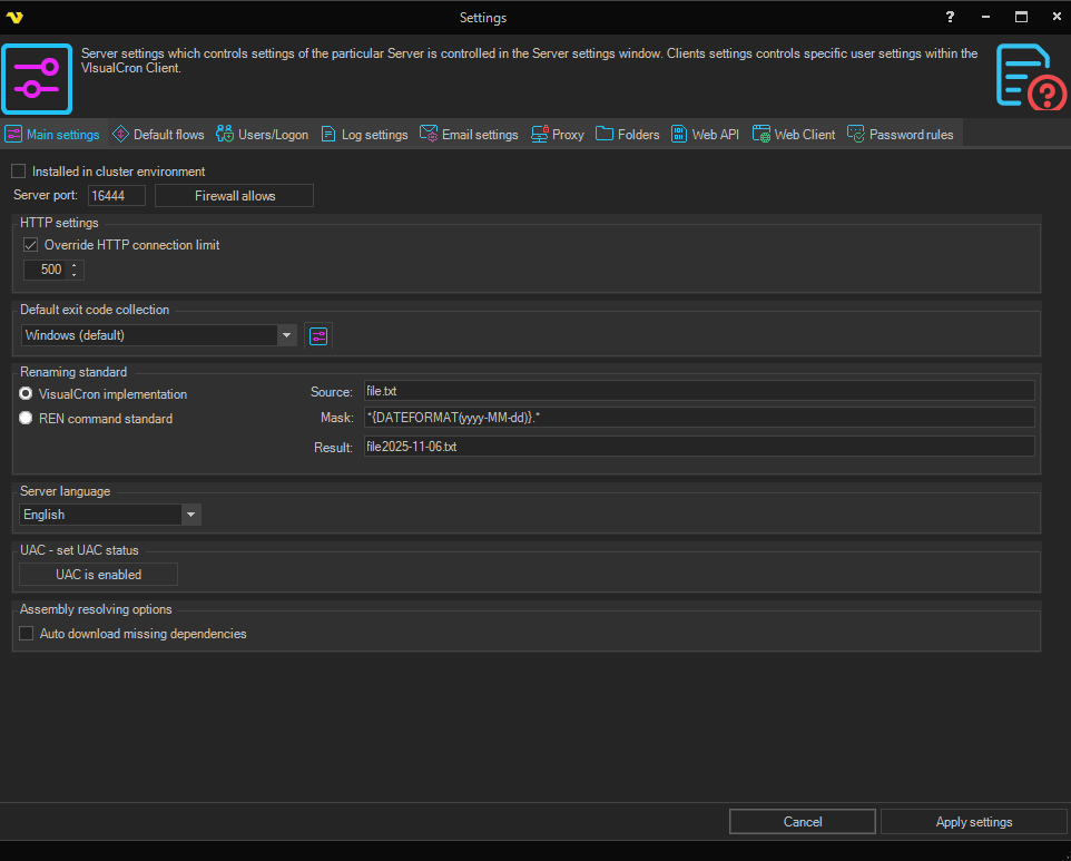 In the main menu Server > Main settings > Settings dialog, there are a set of important setting groups/tabs. See the following sub chapters for information about other tabs than Main settings:
