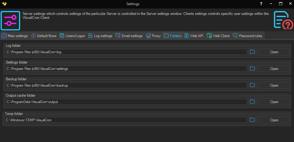In the main menu Server > Main settings > Settings dialog, there are a set of important setting groups/tabs. In this tab, the folder settings are managed.