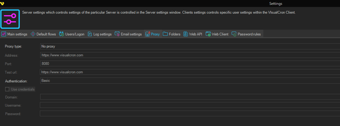 In the main menu Server > Main settings > Settings dialog, there are a set of important setting groups/tabs. In this tab, the proxy settings are managed.