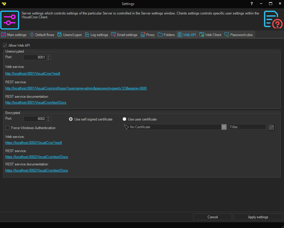 In the main menu Server > Main settings > Settings dialog, there are a set of important setting groups/tabs. In this tab, the web API settings are managed.