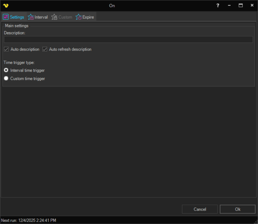 Enter a description which will distinguish several triggers from each other in a trigger list. You can also choose between the Interval Time Trigger and Custom Time Trigger type triggers. One trigger type is always selected and the other option will be grayed out.