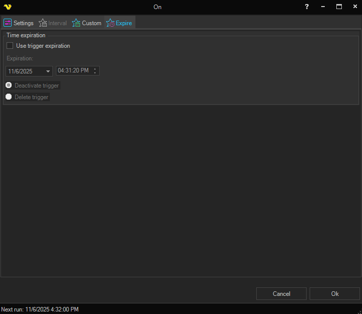 The expiration date/time for the time trigger may be set. Also the handling (Deactivate/Delete trigger) of the expired trigger is selected.