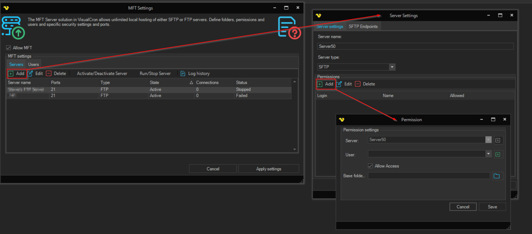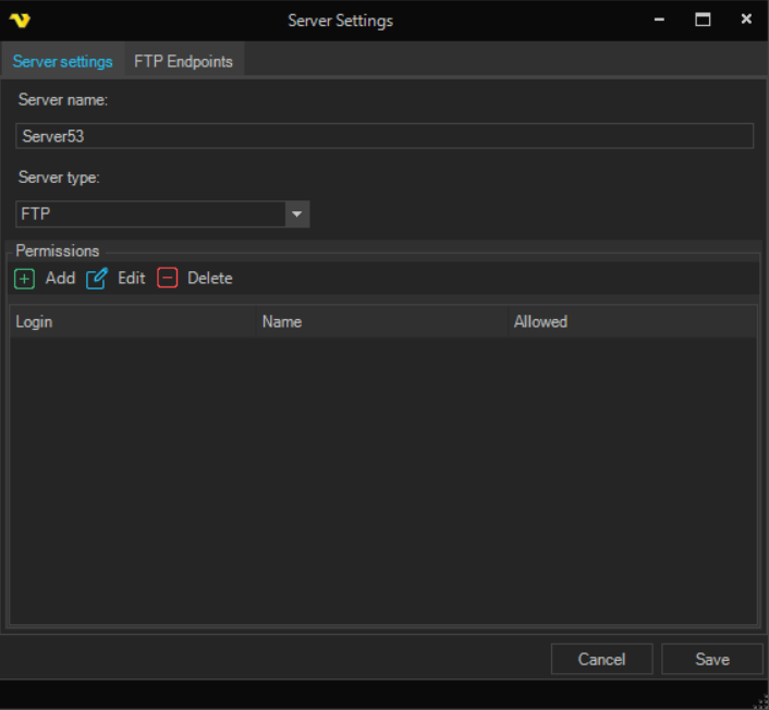 The permissions grid controls who can access the specific MFT server. Click add to add new permission or double click/Edit to edit a permission.