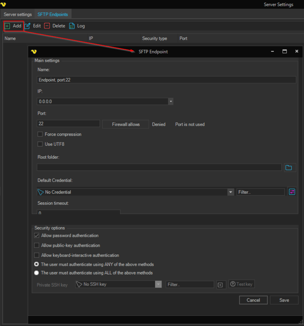 An endpoint is a combination of IP and port the specific MFT server listens to. Click add to add a new MFT server.