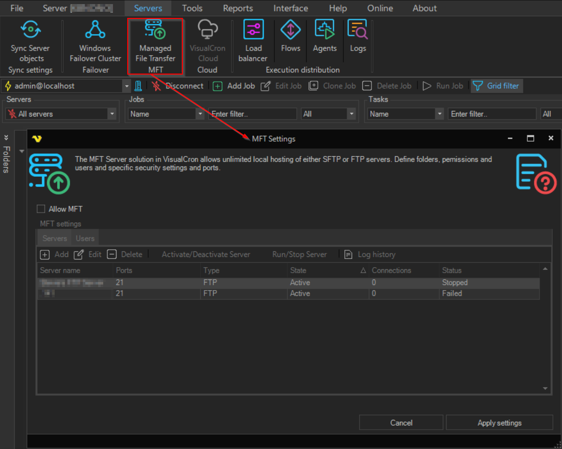 In the main menu Server > Servers > MFT the MFT Server settings are managed.