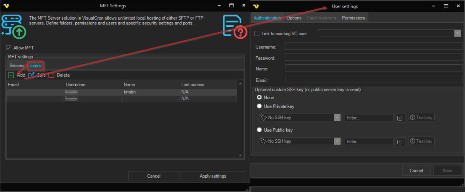 Main > Settings > MFT Server > Users sub tab