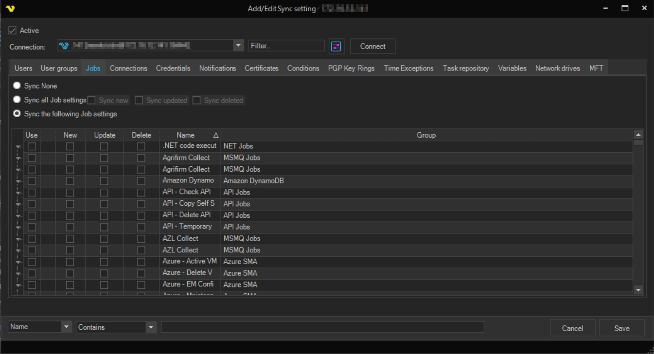 Each object type, Jobs, Settings or other Global objects can be, in detail be synced. This is controlled in respective tab.