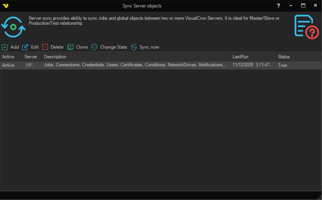 Server Sync provides the ability to sync Jobs and global objects between two or ore more VisualCron Servers. It is idea for Master/Slave or Productio/Test relationships between Servers.