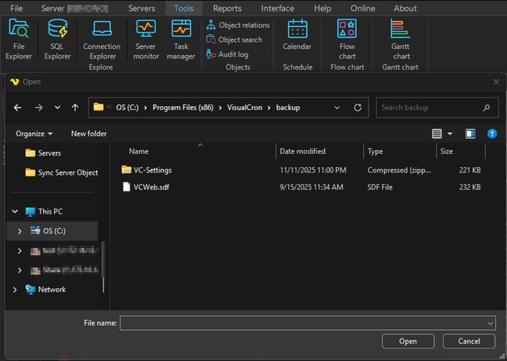 With the main menu Tools > Explore > File Explorer option, you can view folders and files. The File Explorer behaves differently depending on if you are locally or remotely connected.