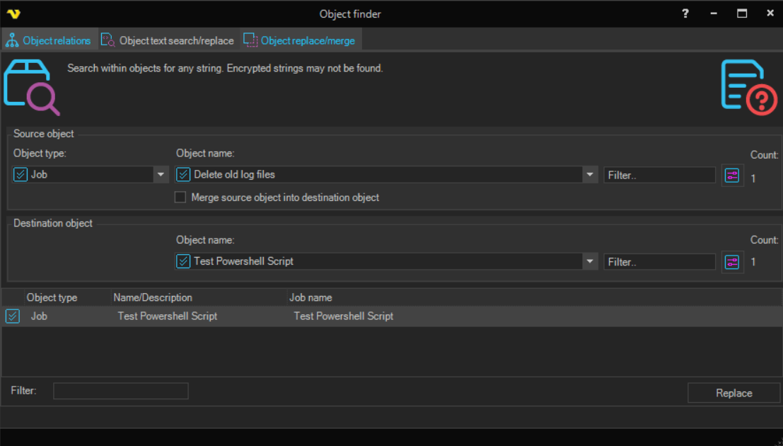 The main menu Tools > Objects > Object Replace/Merge option helps you to find specific objects and replace them. If you need to update a specific credential that is currently being used for multiple jobs, you would look for the credential, then replace it with the newer one.