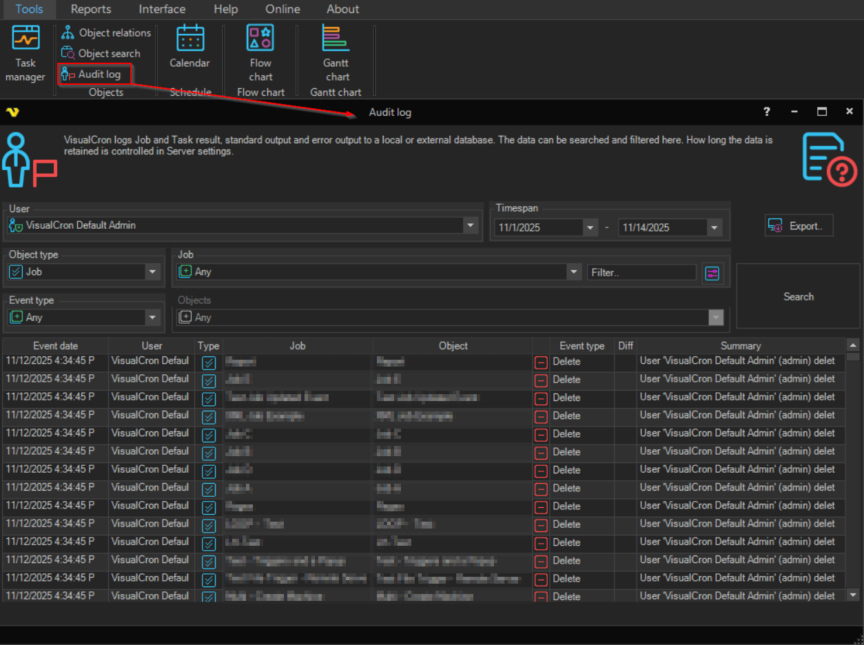 The main menu Tools > Objects > Audit log option is used to track changes among objects within VisualCron. These type of changes are logged an internal database - the same database where Job and Task logs are stored.