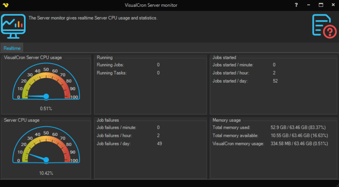 The main menu Tools > Server monitor option shows some server performance parameters and Jobs information.
