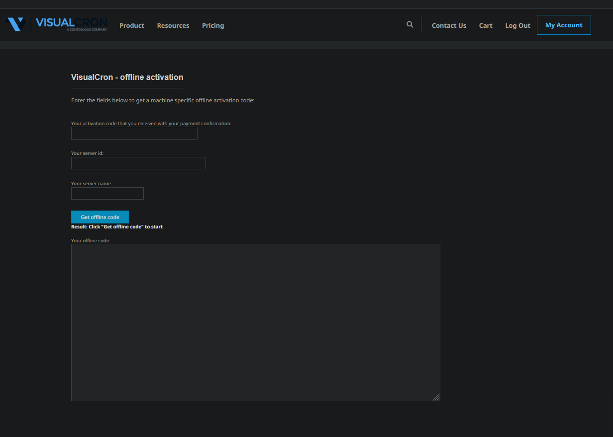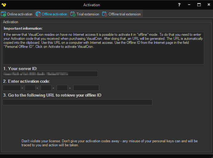 The URL for accessing Offline activation from the VisualCron website is the following: https://admin.visualcron.com/activation/OfflineActivation2024.aspx