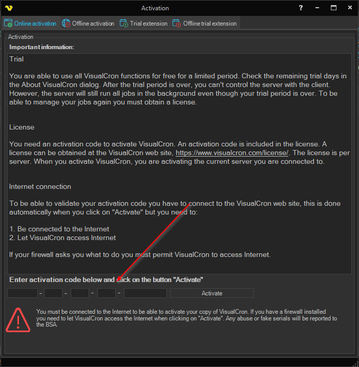 To be able to validate your activation code you have to connect to the VisualCron web site, this is done automatically when you click on the Activate button. However, you need to: