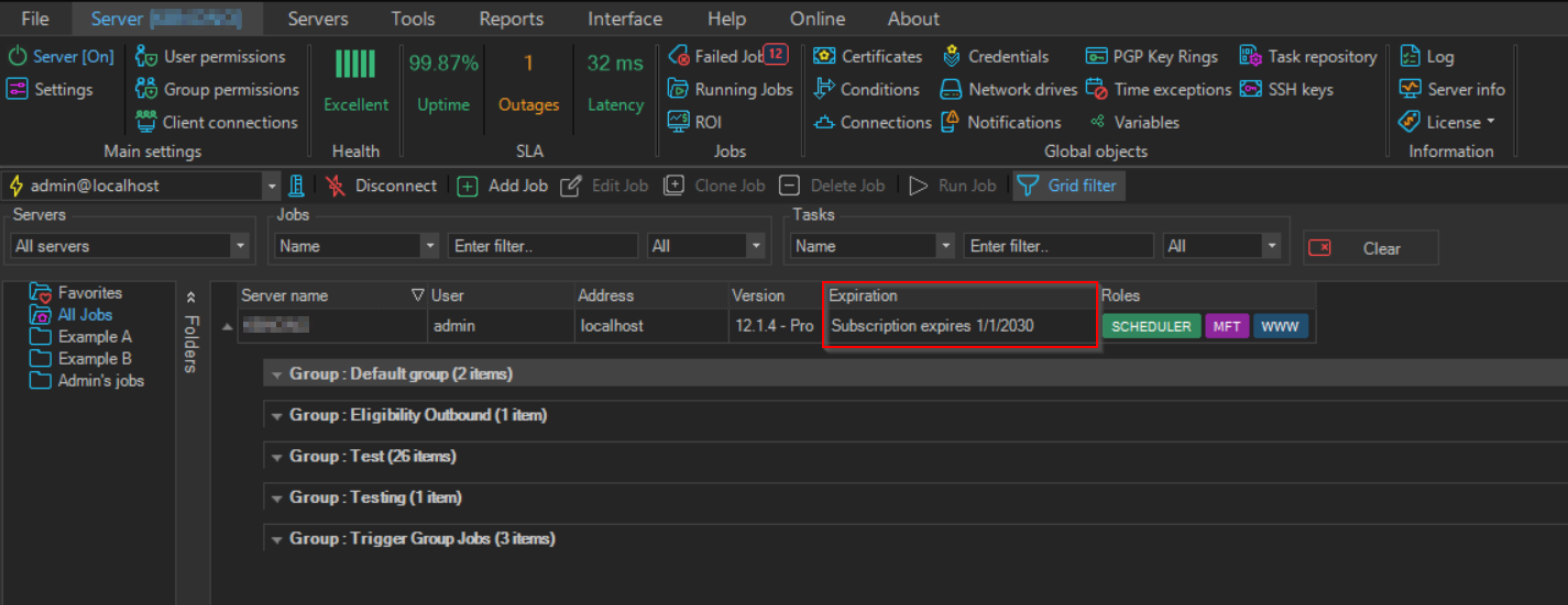 In the Client you can see the expiration date for the Maintenance in the Server row. This date is refreshed from time to time and may not be directly synced in Client when you purchase a renewal of the Maintenance. To force a sync you can right click on the Server row and choose Refresh license data. If the date is not refreshed please make sure you have associated the Maintenance code online that you purchased with the license you wanted to renew. After doing that you can choose to Refresh license data again.