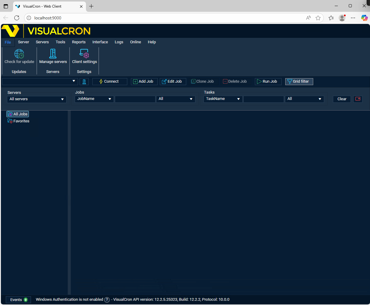 The VisualCron Web Client was introduced in version 7.6.5. It lets you connect from any device (phone/browser) to the VisualCron Server. The web client has a real time interface for viewing Job and Task information. It is still very limited compared to the normal Client but good for getting an overview and do basic things like running, activating and stopping Jobs and Tasks.